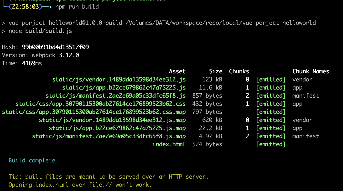 배포를 위해 패키지 파일을 만드는 과정을 빌드라고 한다. vue의 대부분 파일인 javascript, index.html, css 등의 파일을 생성한다.
